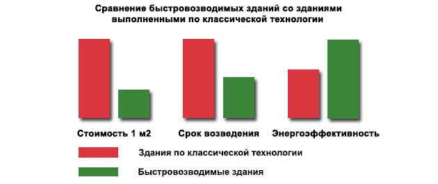Одним из главных преимуществ быстровозводимых зданий считается то, что они позволяют сократить расход материалов практически в полтора-два раза, что уже довольно неплохо. Помимо этого, их использование помогает также снизить общую массу постройки приблизительно в три-четыре раза. А это, в свою очередь, ведет к снижению трудозатрат производства приблизительно на полтора раза. Таким образом, современные технологии строительства позволяют сделать строительство зданий более выгодным как с экономической, так и с других точек зрения.