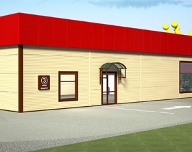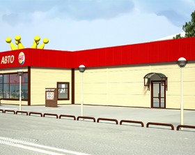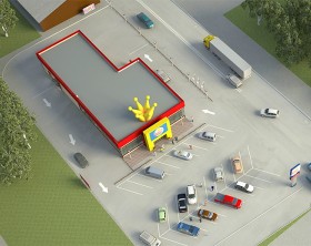 Одноэтажное здание размером 18х36м. Полезная высота потолка 4,7м. В здании расположены помещение столовой 324м2, помещение кухни, складское помещение, помещение холодильник, а также подсобные помещения. Для расширения зоны обслуживания клиентов предусмотрена возможность продажи блюд по меню в легковые автомобили. Для этого предусмотрено три окна выдачи и стойка с видеосвязью для формирования заказов. Здание выполнено на основе металлокаркаса и сендвич-панелей.